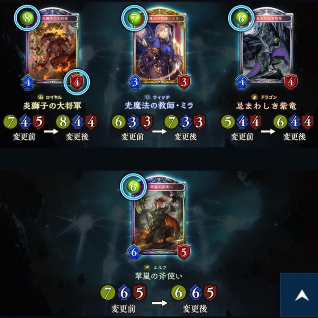 ナーフの影響でマナリアWの減少が見られ環境に変化が現れた。Rもアグロプランに寄せるために「簒奪の使徒」や「簒奪の絶傑・オクトリス」が抜けているリストが多かったが炎獅子の大将軍ナーフによりミッドレンジに寄せるために再びリストに入ることになった。